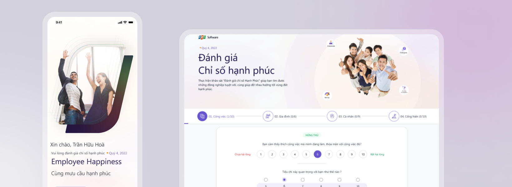 Employee Happiness is an internal platform of FPT Corporation designed to evaluate and enhance worker satisfaction indicators. The system will identify individuals who can help and accompany one another based on each employee's happiness evaluation, leading to a happy team.
