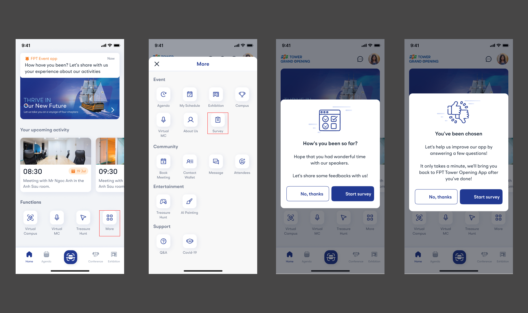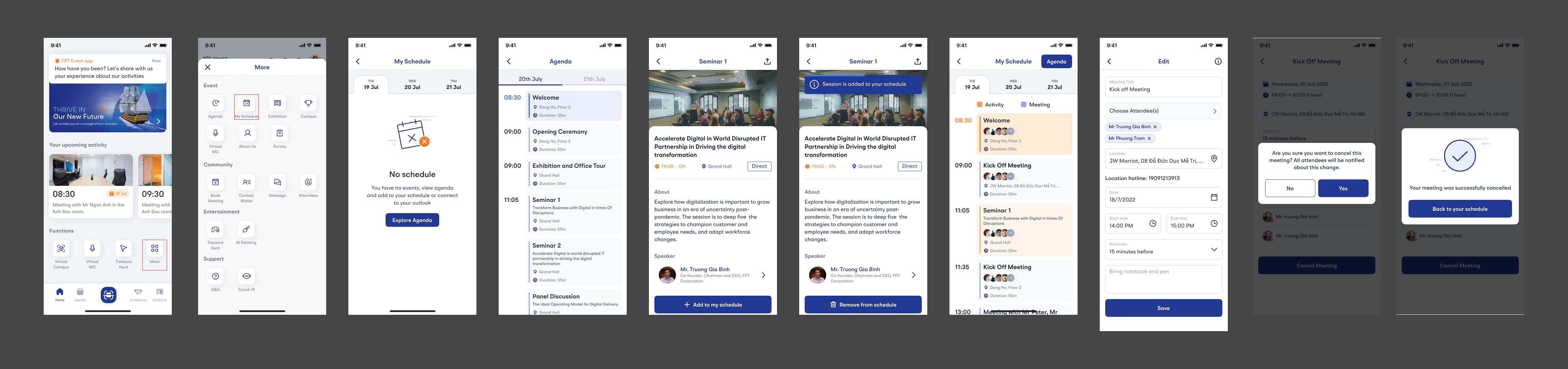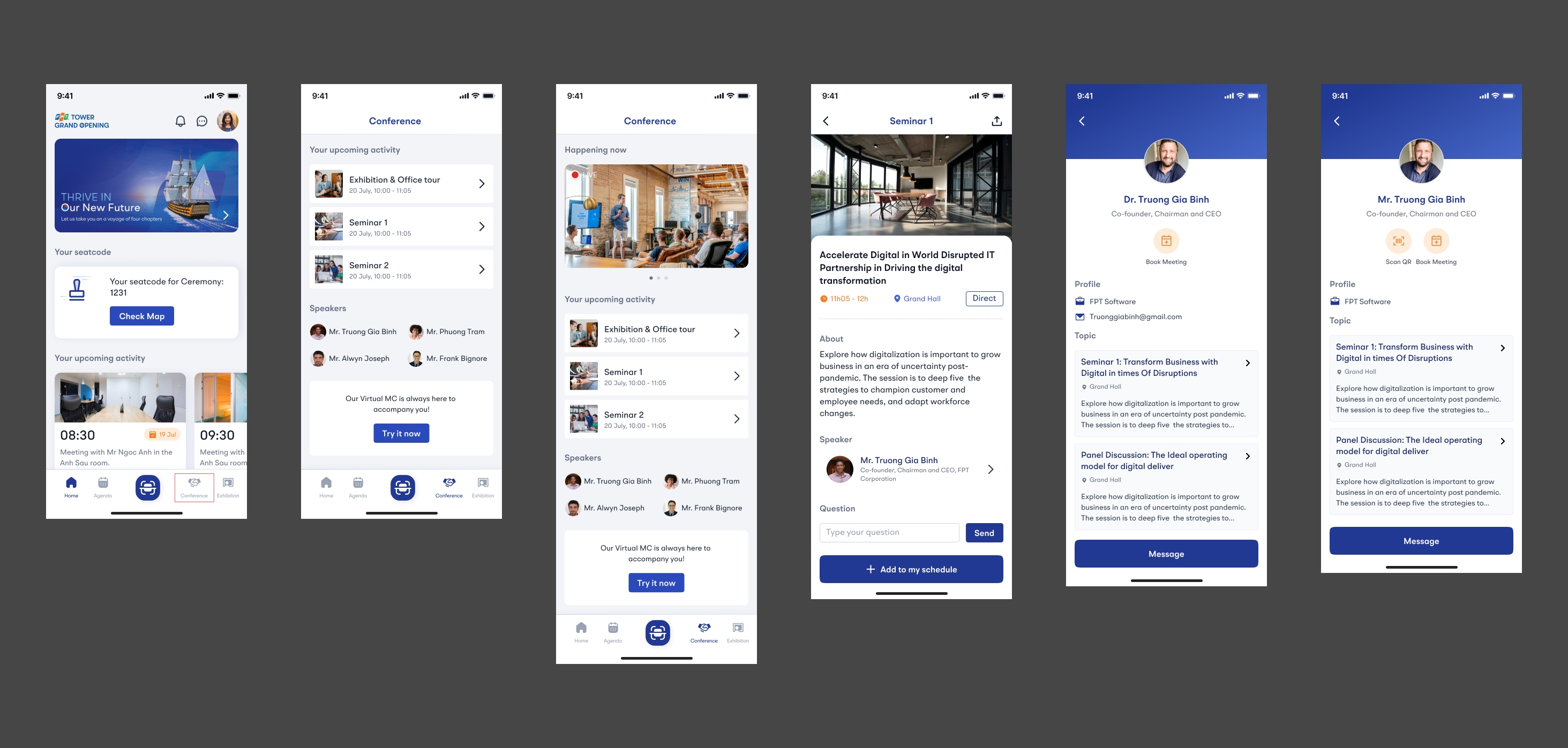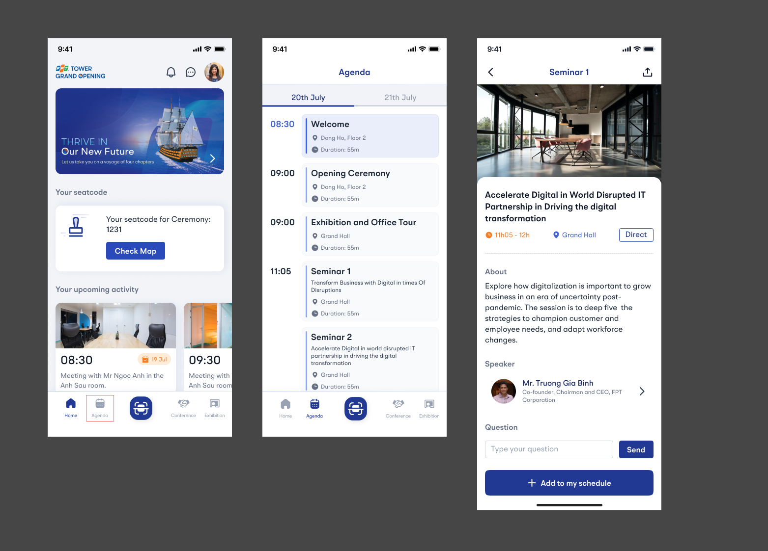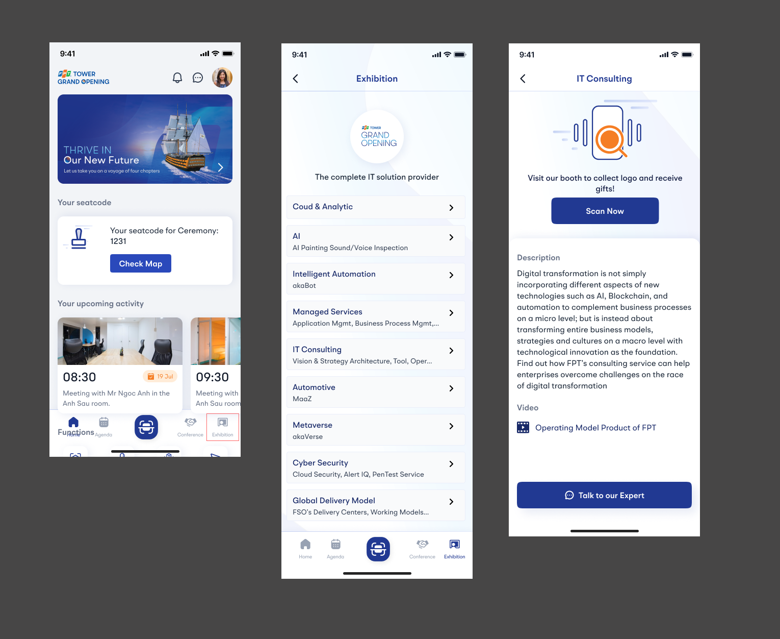 A mobile app developed for the launch event of FPT's headquarters building. The app is designed for guests, including entrepreneurs, partners, and clients, allowing them to experience innovative technology products, network, and connect with other FPT partners.