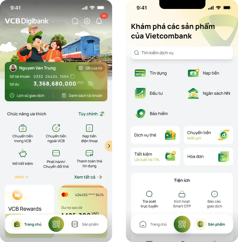 Inspired by the concept of a smart home, the new-generation VCB Digibank emphasizes personalization and seamless usability. The experience is designed to help users access familiar features with minimal effort ("low-touch"), while also encouraging them to explore and engage with Vietcombank’s diverse range of services through intuitive touchpoints along their journey.