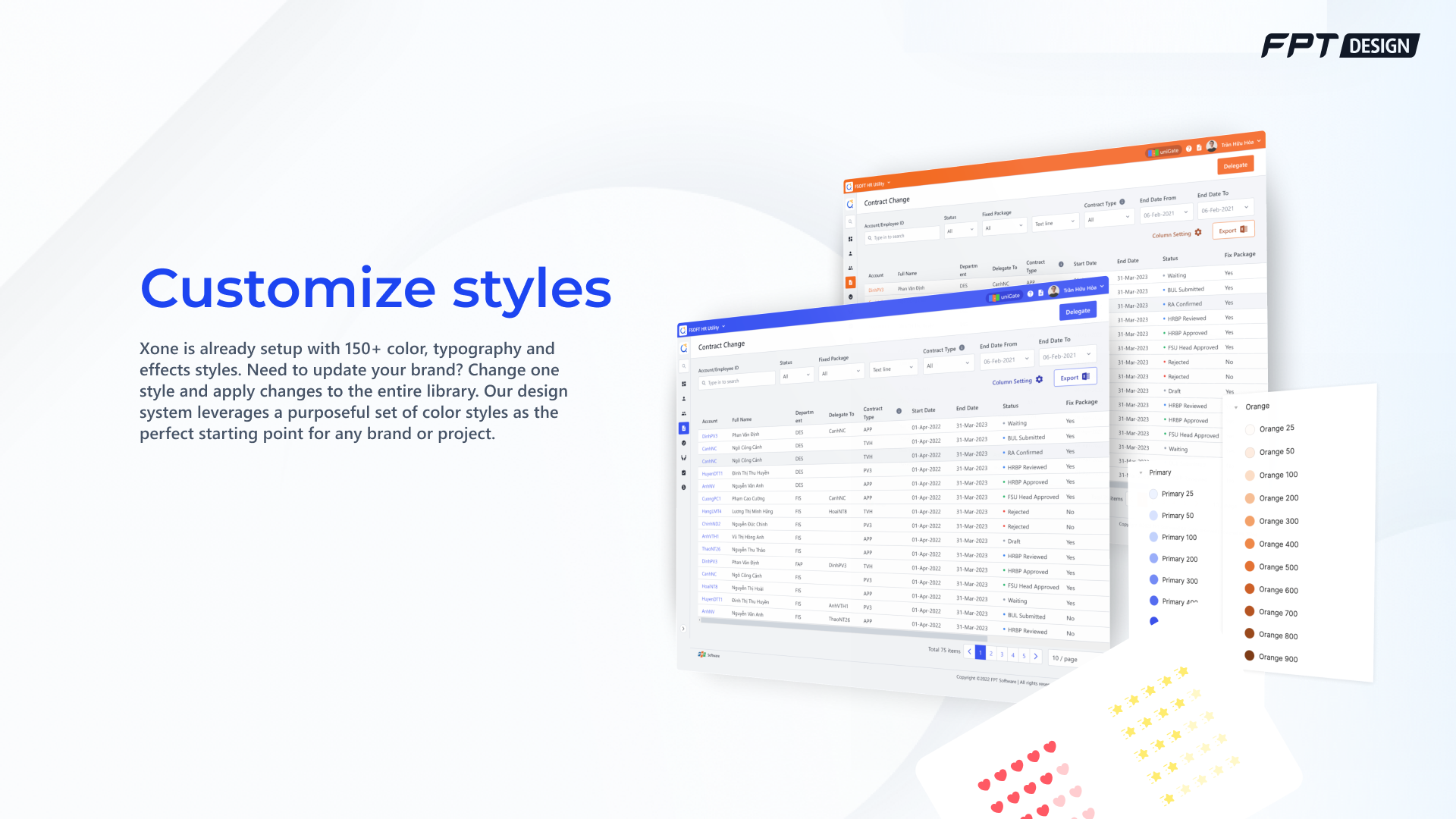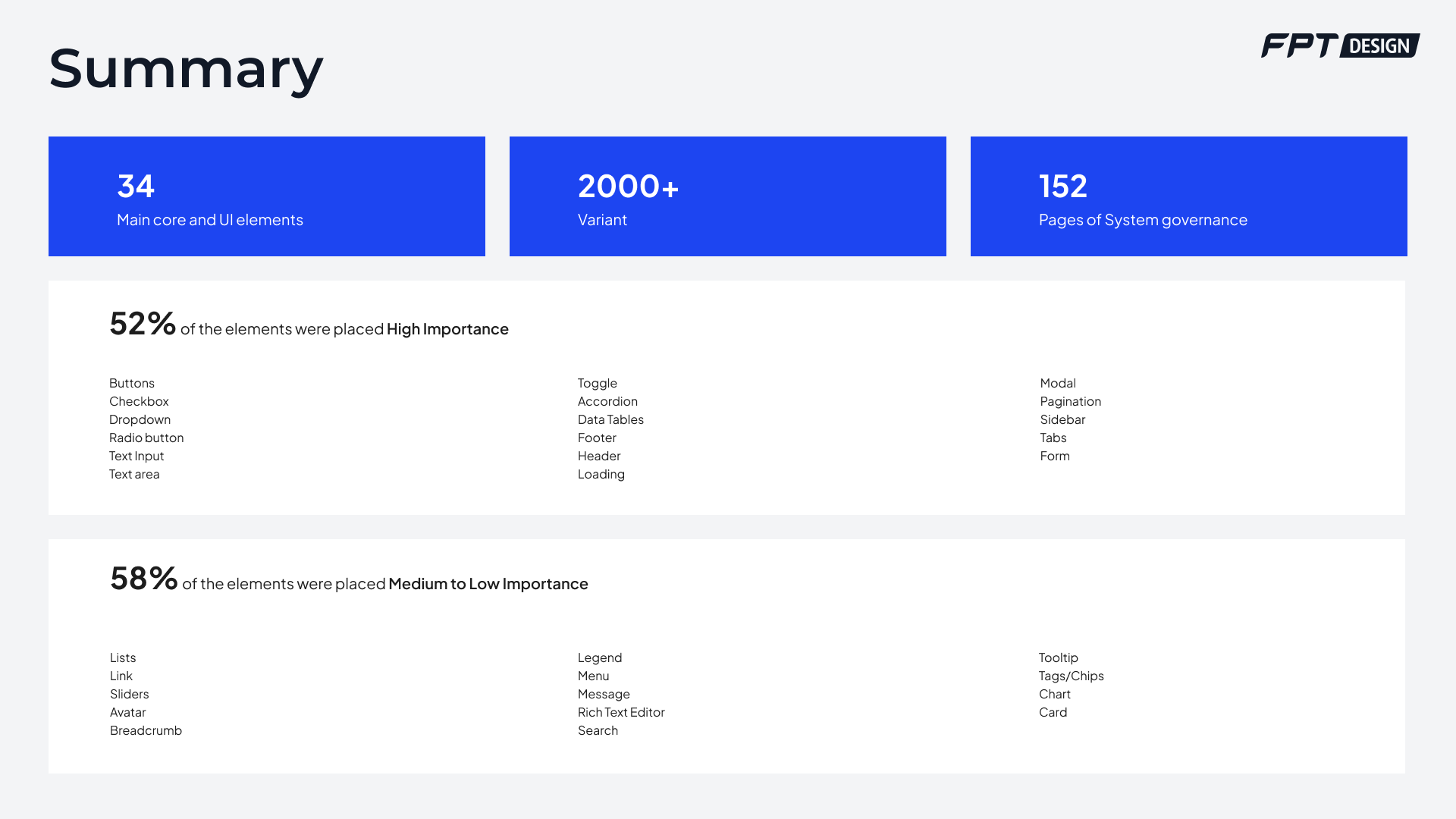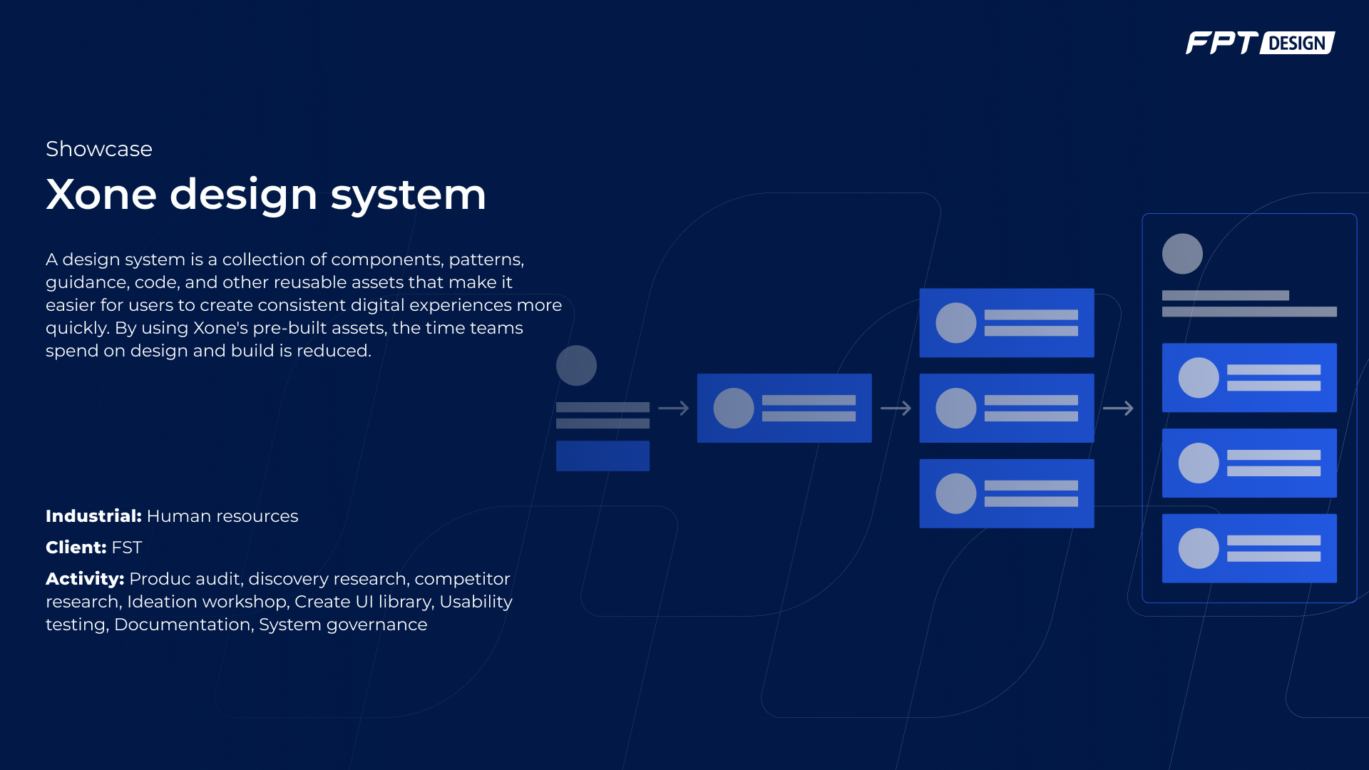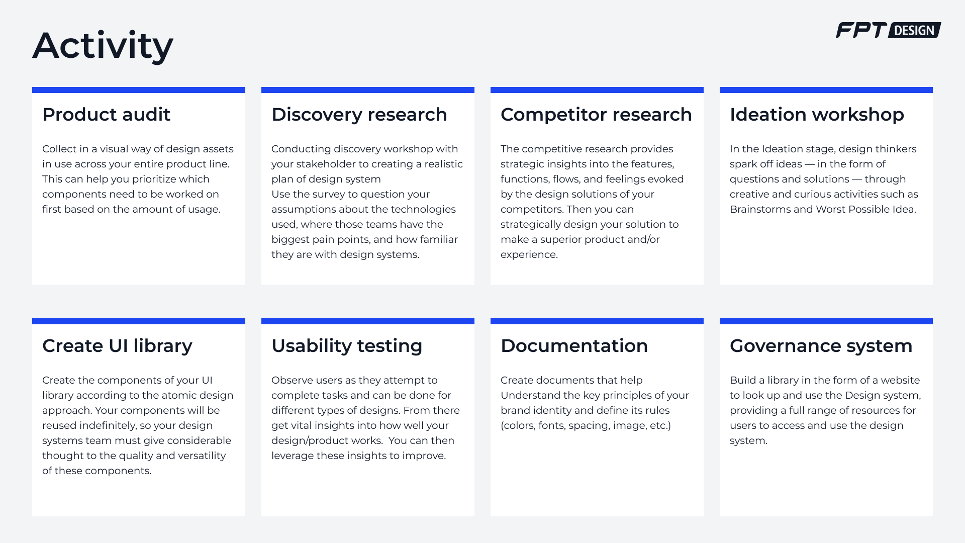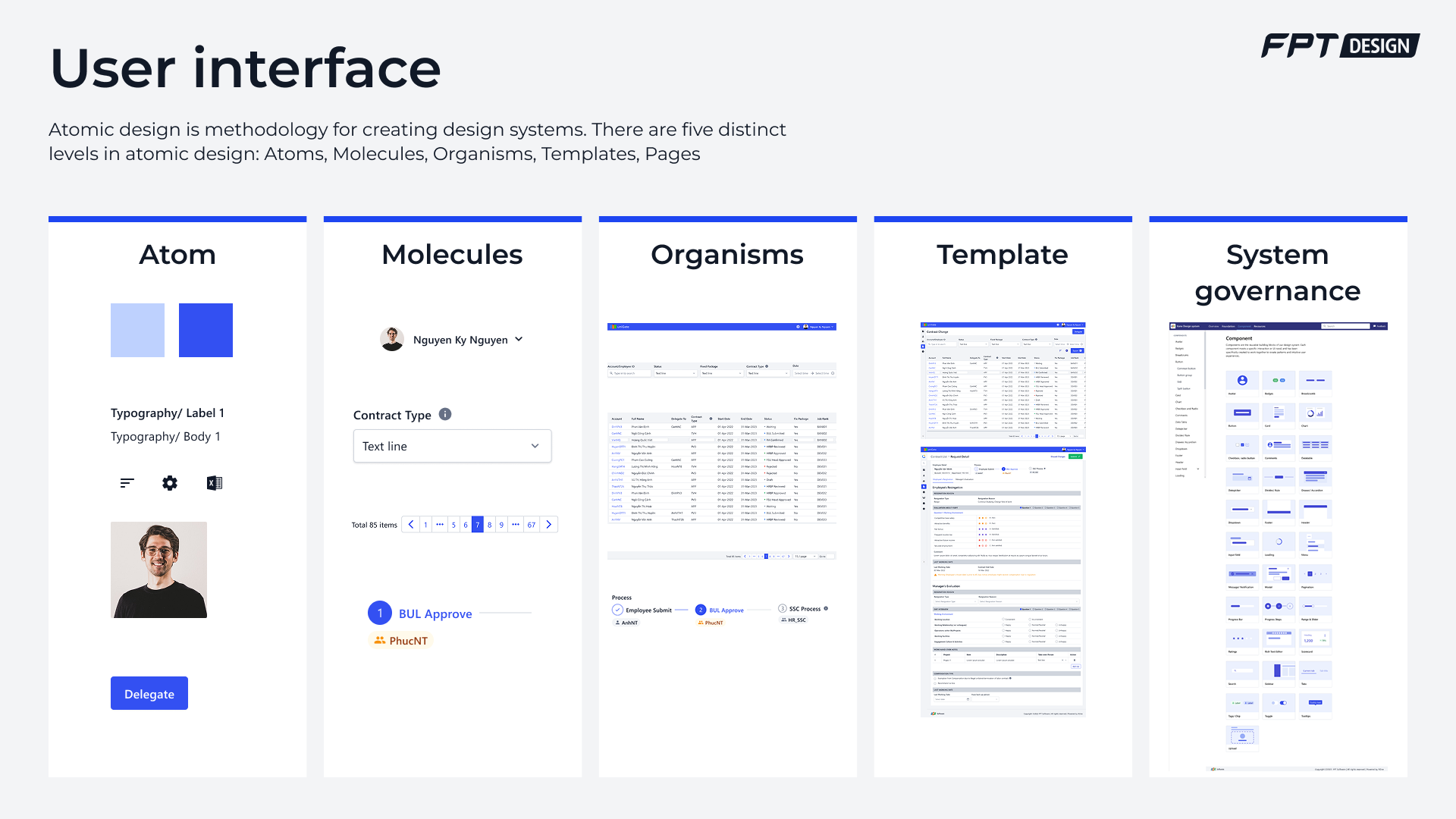 Design collection of reusable components with clearly defined standards for use to apply across FPT’s software operation tools. These components combine pattern libraries, colors, and fonts with standardized design principles to help FPT achieve consistent visual design at scale.